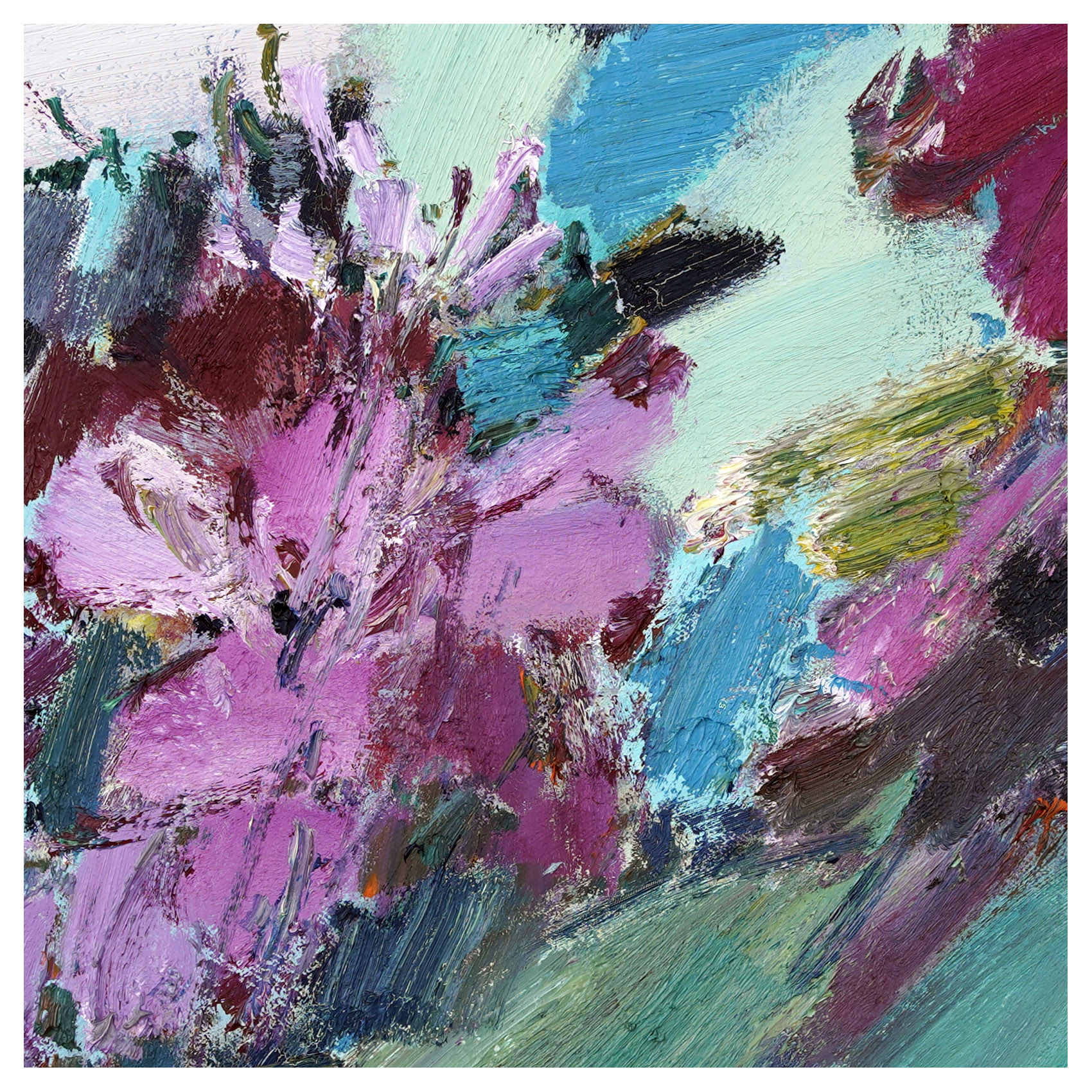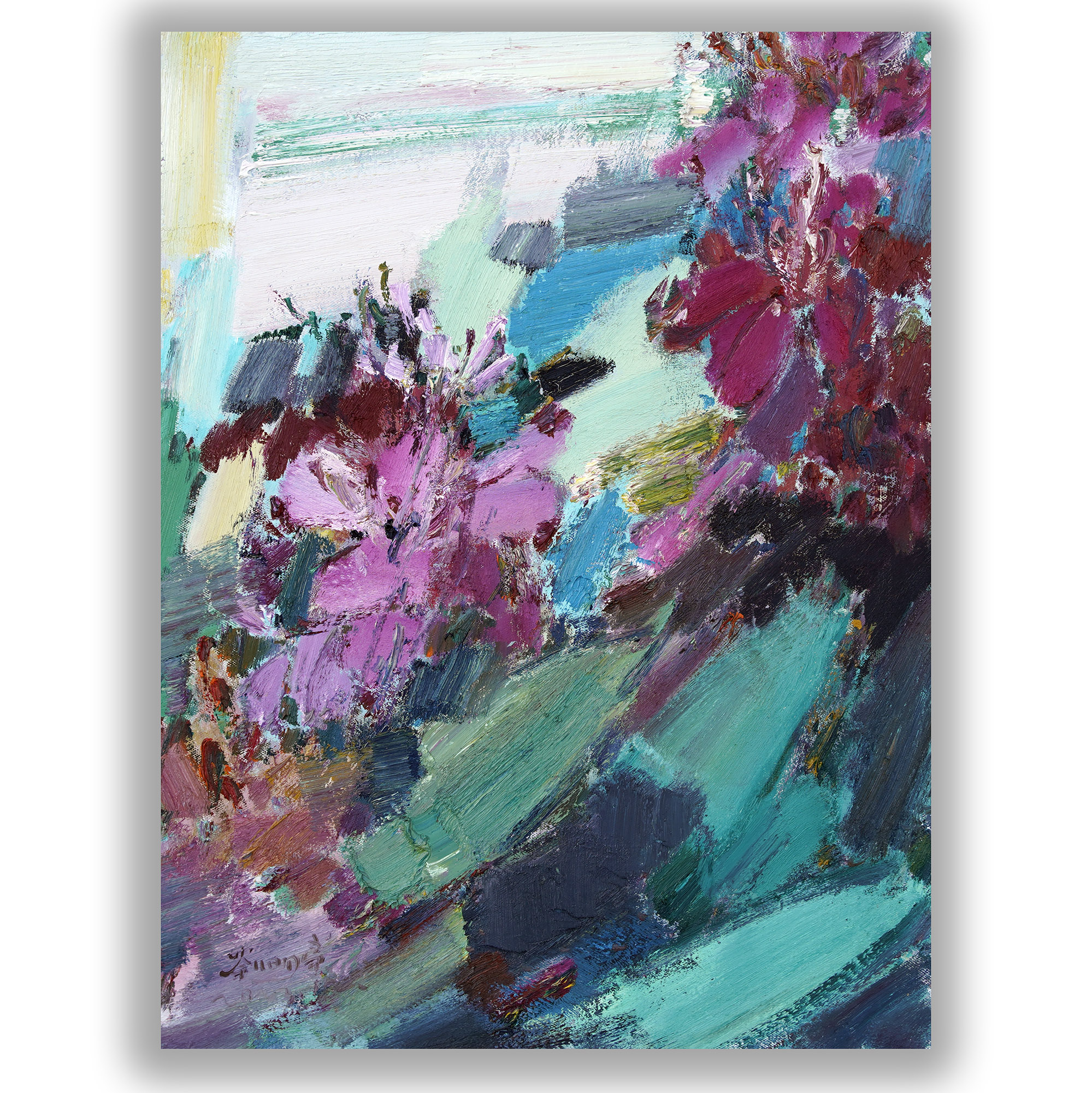 I paint the “in-between”—where the vibrant crimsons and lush emeralds collide, and where form begins to fade into pure emotion. I don’t wish to explain this beauty; I only hope that when you stand before these colors, you feel the raw pulse of life. May these brushstrokes stir the silent depths within you, touching that sacred place where words are no longer needed, and only the soul remains.