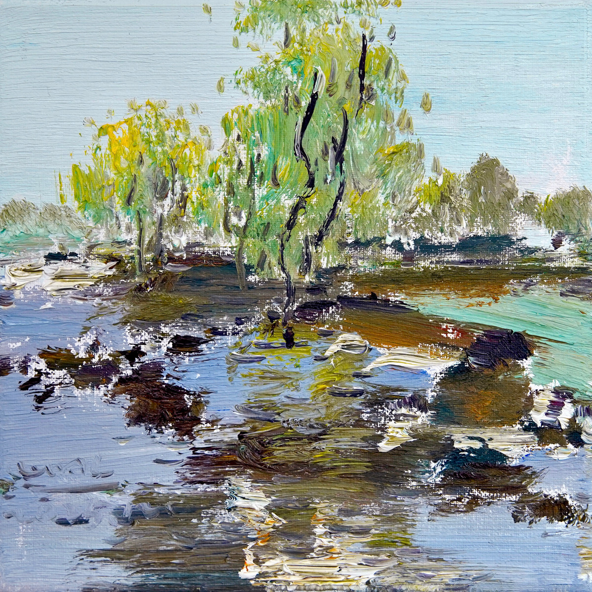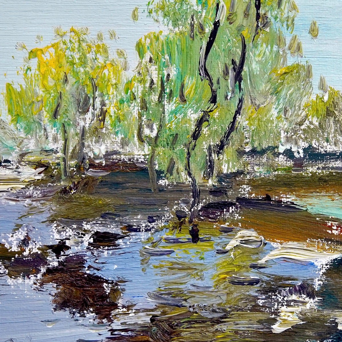 This piece, “Early Spring,” utilizes vibrant greens and expressive, textured brushwork to capture the awakening of nature. The compact square format concentrates the energy of the season, making it a “poetic window” for any interior space.